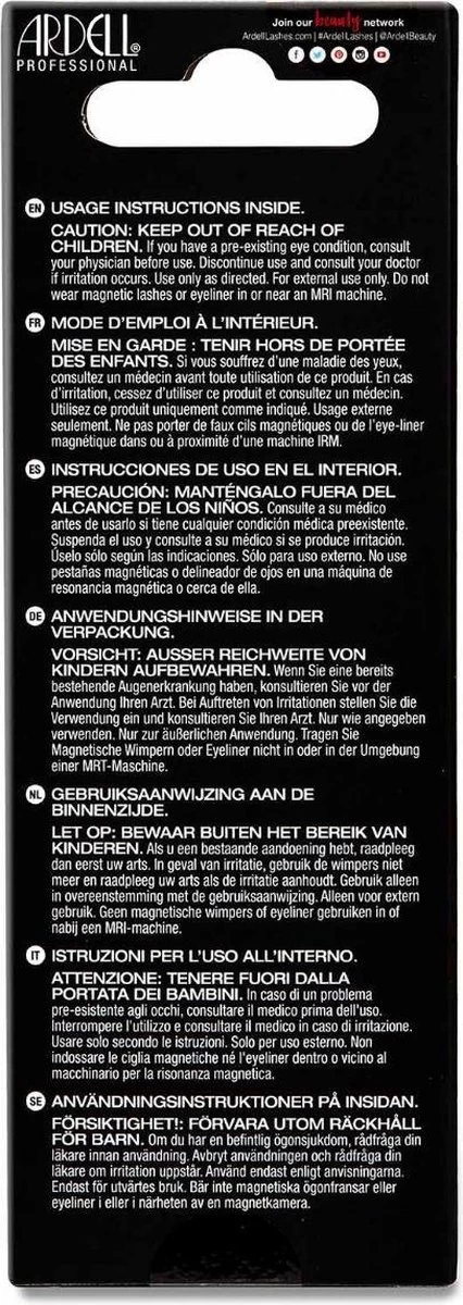 Let op: buiten het bereik van kinderen houden. Raadpleeg voor gebruik je arts als je een reeds bestaande oogaandoening hebt. Stop het gebruik en raadpleeg je arts als irritatie optreedt. Gebruik alleen zoals aangegeven. Alleen voor uitwendig gebruik. Draag geen magnetische wimpers of eyeliner in of nabij een MRI-machine.