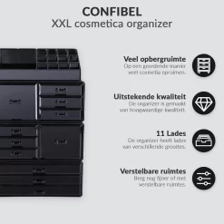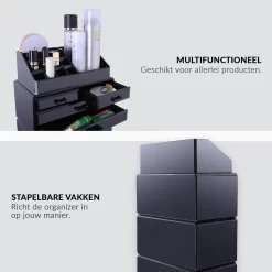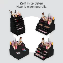 Wil je snel en op een georganiseerde manier al je make-up opruimen? Met de Make-up Organizer met Lagen is snel geregeld. Het heeft meerdere lades en vakken voor grotere dingen. Er zijn grote en kleine lades zodat verschillende groottes make-up erin passen. Door het ontwerp neemt het niet veel ruimte op je bureau, badkamer of kast en het ziet er mooi uit. Ook kun je zelf kiezen hoe de lades en vakken in de Organizer zitten en dus de meest comfortabele lay-out kiezen die je wilt.