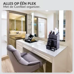 Nadat je het product in ontvangst hebt genomen moet je eerst een geschikte locatie vinden om de Make-up Organizer met Lagen neer te zetten. Na dit te hebben gedaan kun je ervoor kiezen om de lay-out zo te houden of op een andere manier in te richten. Als je dit eenmaal hebt besloten mag je je make-up opbergen en wensen wij jou veel plezier.