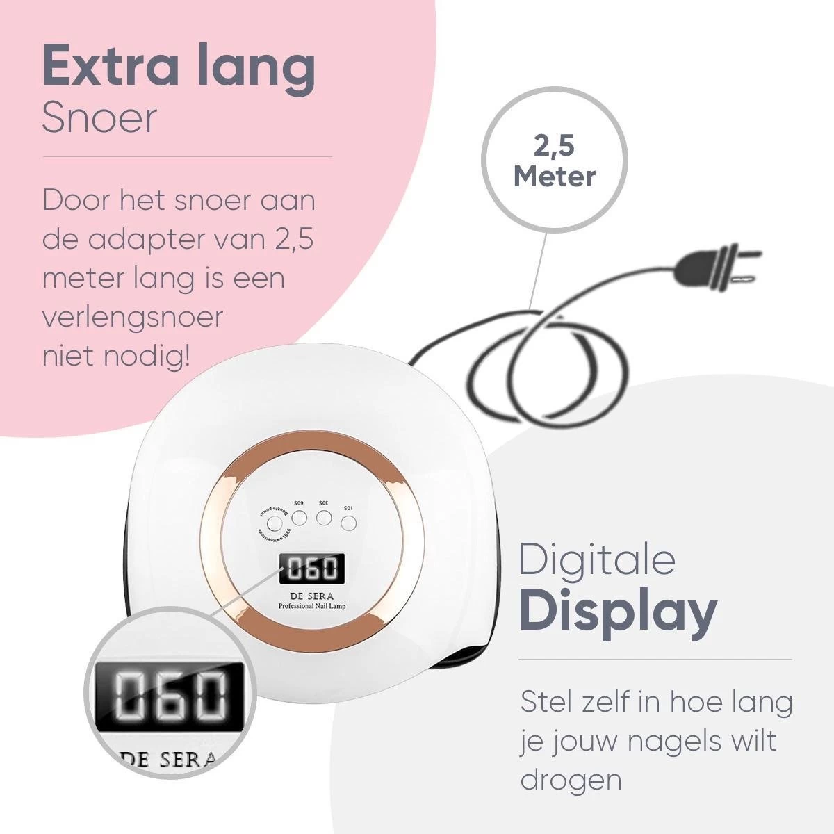 Geen gedoe meer met verlengsnoeren. Deze UV Lamp heeft een adapter met een 2.5 meter lang snoer waardoor je de lamp overal neer kunt zetten. Ga lekker aan tafel zitten en geniet van een heerlijk avondje nagels verzorgen 🙂