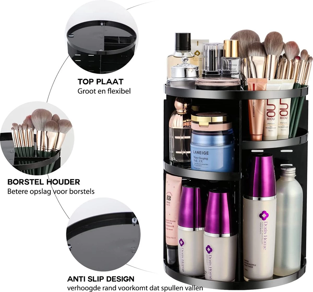 Door het eenvoudige design organiseer en bewaar jij jouw cosmetica en accessoires perfect; Je hebt gemakkelijk toegang tot al je make-upproducten doormiddel van de draaifunctie. Veel ruimte voor lippenstiften, foundation, poeders, nagellak, lotions, eyeliners, make-upborstels, parfums en meer. één handige plek om al uw persoonlijke schoonheidsartikelen te bewaren, waardoor u ruimte op de plank en aanrecht bespaart, terwijl alles georganiseerd en opgeruimd blijft.