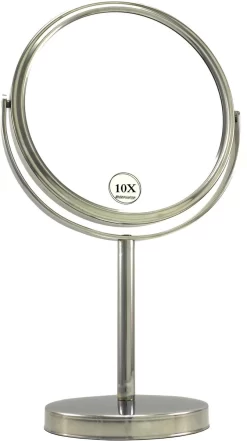 Bent u nog op zoek naar een fijne en betaalbare stand spiegel? Dan hebben wij het product wat u zoekt. Namelijk deze Make-up Spiegel met een doorsnee van 18 centimeter. De Make-up Spiegel beschikt ook over een 10 maal vergrotende kant zodat u alle details extra goed kunt zien. U kunt de Make-up Spiegel helemaal te roteren zodat u makkelijk kunt switchen tussen de normale en vergrotende kant. De Make-up spiegel is gemaakt van hoogwaardige kwaliteit metaal waardoor deze niet snel zal krassen, slijten of roesten, ook de levensduur word hierdoor aanzienlijk verlengd. Het mooie chromen uiterlijk zorgt ervoor dat dit product strak, hip en tijdloos is waardoor deze overal mooi tot zijn recht zal komen. De onderkant is voorzien van schuimrubber wat zorgt voor extra grip en voorkomt krassen op bijvoorbeeld uw badkamer meubel, tafel of kast.