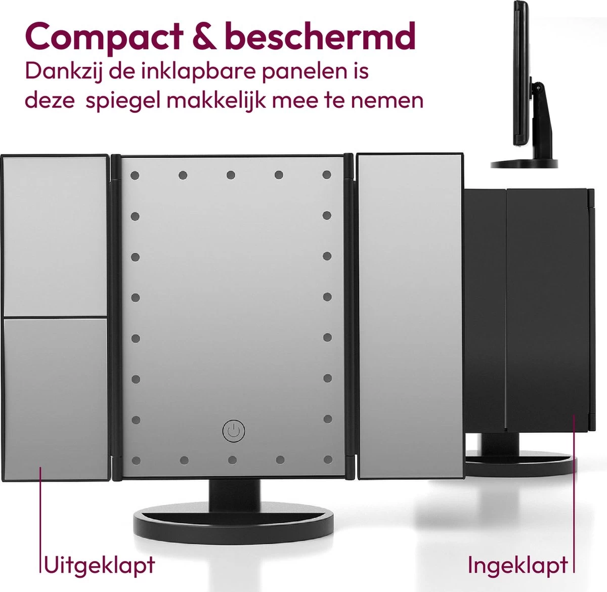 Inklapbaar – Door het drieluik ontwerp is de spiegel inklapbaar en gemakkelijk mee te nemen waar jij dat wilt. Zo kun je deze spiegel ook meenemen op vakantie of een weekendje weg.
