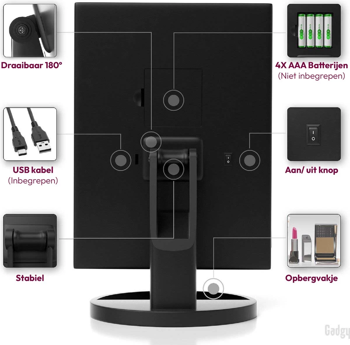 180° draaibaar – De spiegel is 180° draaibaar, waardoor je de spiegel volledig kunt draaien naar jouw wens. Hierdoor kun je vanuit elke hoek perfect je make-up aanbrengen.