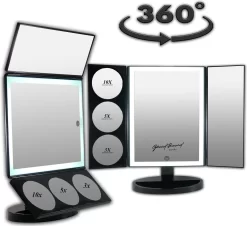 strakke en uiterst handige drieluik make-up spiegel. De make up spiegel is een stuk groter dan zijn voorganger. Deze spiegel beschikt over 1x (normaal) 3x 5x en 10x vergroting zodat er altijd een vergroting voor jou bij zit. Het licht is deze keer strak verwerkt in de randen met een mooie witte lijn die fel oplicht en hierdoor een helder wit daglicht afgeeft voor een perfect resultaat. Ook kunt u de spiegel gemakkelijk dimmen door de touch knop langer ingedrukt te houden. De spiegel word geleverd met USB kabel zodat de spiegel ook op een vaste plek neergezet kan worden. Ook is de spiegel in beide zijde kantelbaar zodat deze ook op een lager tafeltje te gebruiken is.