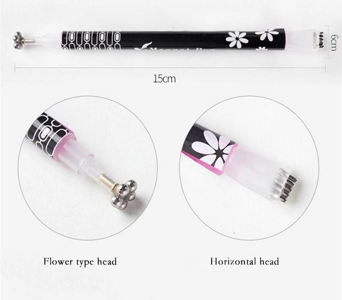 Hoe eenvoudig dit werkt zie je op de bovenstaande afbeelding. Je brengt de Magnetische gellak aan over de Base Gel en gaat er dan met de Gellak Magneet rustig overheen. Je ziet gelijk welk effect je creëert met welke beweging je maakt. Beide uiteindes van de Gellak Magneet geven een ander effect op je Gel Nagellak Nagels.