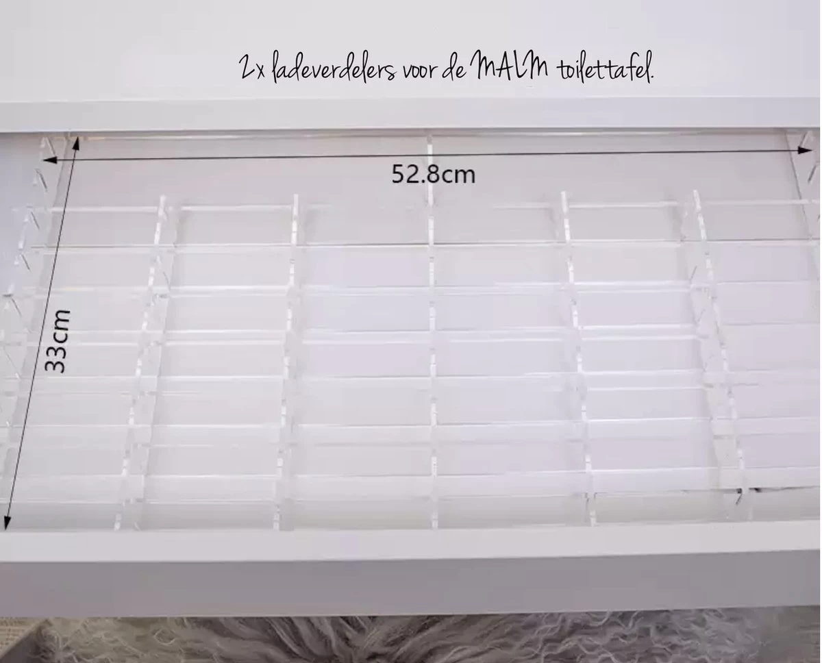 Met de makeup ladeverdeler voor de MALM toilettafel ziet jou lade er weer netjes en georganiseerd uit! Ze zijn aan te passen naar wens. Dit is een must voor alle makeup liefhebbers die al hun mooie makeup het plekje willen geven dat ze verdienen.