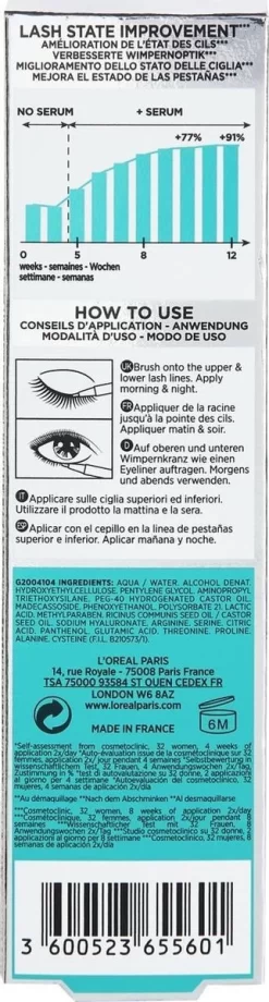 L’Oréal Paris Clinically Proven Lash Serum is een verzorgend Wimperserum. Het verbetert de conditie van de wimpers na acht weken tijd! De formule is namelijk verrijkt met 6 actieve wimperverzorgende ingrediënten waaronder hyaluronzuur.
