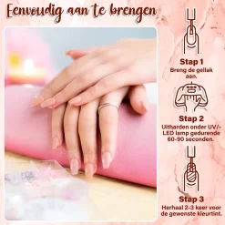 De gellak breng je aan met een Primer, Base Coat en Top Coat en hard je uit door middel van een UV of LED lamp. Deze gel nagels blijven 2 tot 4 weken zitten en hebben onmiddelijk een glanzend effect. De gellak is vrij van schadelijke stoffen wat de nagels stevig en sterk houden.