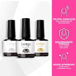 Voor een goede hechting en een mooi, glanzend en langdurig resultaat, is het belangrijk een Primer, Base Coat en Top Coat te gebruiken. Met deze 3-delige set van Luneya is het mogelijk je mooie resultaat voor een langere tijd te behouden.