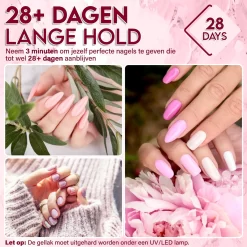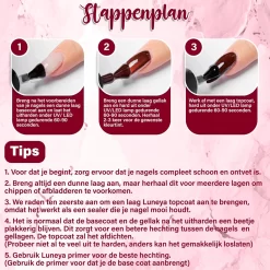 De gellak breng je aan met een Primer, Base Coat en Top Coat en hard je uit door middel van een UV of LED lamp. Deze gel nagels blijven 2 tot 4 weken zitten en hebben onmiddelijk een glanzend effect. De gellak is vrij van schadelijke stoffen wat de nagels stevig en sterk houden.
