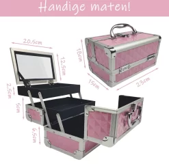 - Ruim en praktisch: Met afmetingen van 23 x 15 x 15 cm is deze make-up koffer flexibel en er passen verschillende maten cosmetica in. Denk hierbij aan lippenstiften, eyeliner, make-up kwasten, nagellak en essentiële oliën. Er is een groot vloeroppervlak voor waar zelfs reisformaat flessen in passen.