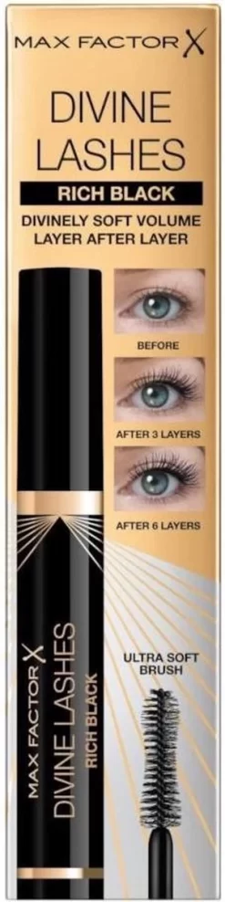 Max Factor Divine Lashes Mascara – 01 Black is dé mascara die je oogverblindende lange en volumineuze wimpers geeft die goddelijk zacht aanvoelen. De formule voelt ultra licht aan op je wimpers en breng je laag voor laag aan om een onweerstaanbaar dramatisch en volumineus wimpereffect te creëren. De Max Factor Divine Lashes Mascara is verrijkt met panthenol, deze pro-vitamine B5 zorgt voor soepele en zachte wimpers. Dit maakt de Divine Lashes Mascara ook geschikt voor contactlensdragers. De rijke romige formule brengt veegvast en gelijkmatig aan. Het definieert de wimpers vanaf de aanzet tot aan de top zonder te klonteren. De fijne borstelapplicator ligt prettig in de hand, is extreem zacht en brengt de mascara vlokvrij aan. Het verdeelt de mascara met precisie, iedere wimper wordt gedekt voor een ultra natuurlijk volumineuze finish.