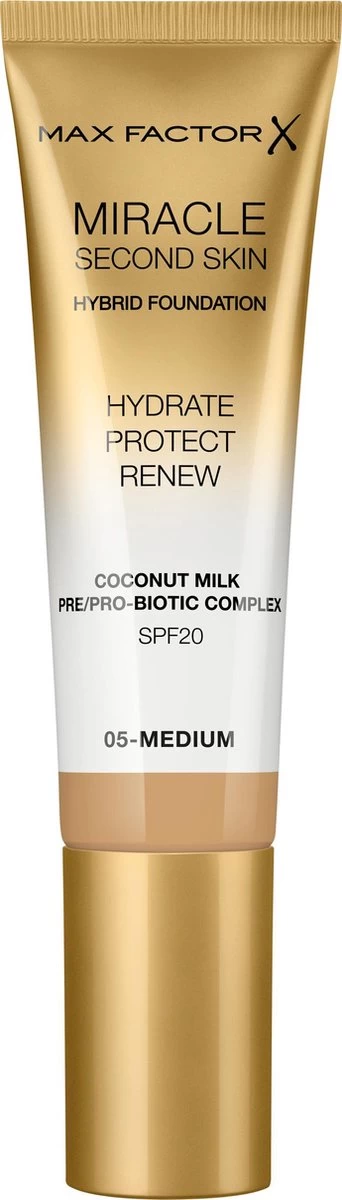 Max Factor Miracle Second Skin Foundation vervaagt imperfecties en geeft de huid een egale teint. Tegelijkertijd levert het bescherming en is de foundation verrijkt met huidvriendelijke voedingsstoffen zoals kokosmelk, glycerine en aloë vera. De Max Factor Miracle Second Skin Foundation helpt de huid in balans te brengen en maakt de huid net zo mooi als de binnenkant!
