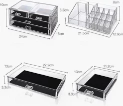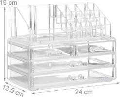 De stapelbare make-up organizer zorgt voor orde op je makeuptafel en bespaart je het zoeken in je toilettas. De tweedelige make-up standaard biedt met veel opslagruimte voor cosmetica en sieraden. De lades zijn geschikt voor crèmes, poeder en oogschaduw, als ook voor ringen, kettingen en armbanden.