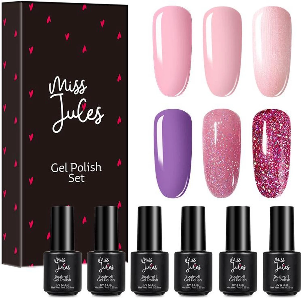 Met deze 6-delige gel nagellak set van Miss Jules heb je keuze uit 6 trendy kleuren voor elke gelegenheid. Deze gellak kan zowel op een natuurlijke nagel als op een kunstnagel worden aangebracht.