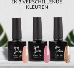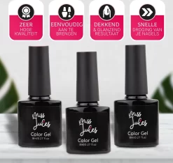 Met deze 3-delige gel nagellak set van Miss Jules heb je keuze uit 3 trendy kleuren voor elke gelegenheid. Deze gellak kan zowel op een natuurlijke nagel als op een kunstnagel worden aangebracht.