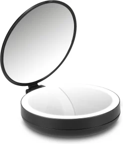 - Deze zakspiegel met ledlamp, standaardfunctie en extra vergrootfunctie zorgt voor een perfecte focus op je gezicht, zowel thuis als op reis. Voorzien van 2 spiegels met 1x vergroting en 5x vergroting, ideaal om je make-up onderweg bij te werken.