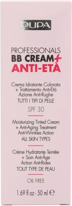 De PUPA BB Cream Anti-Eta is een speciale crème met “anti-aging” behandeling voor het gezicht. De vocht inbrengende crème maakt de huid glad en helpt tekenen van veroudering te beschrijden. De aanwezige SPF 30 bescherming in de crème zorgt ervoor dat de huid beschermt is tegen de schadelijk Uv-straling van de zon. Deze multifunctionele BB Cream is een perfecte crème voor mensen met weinig tijd, maar die wél een verzorgde en stralende huid willen! De BB Cream is van licht dekkend naar vol dekkend op te bouwen.