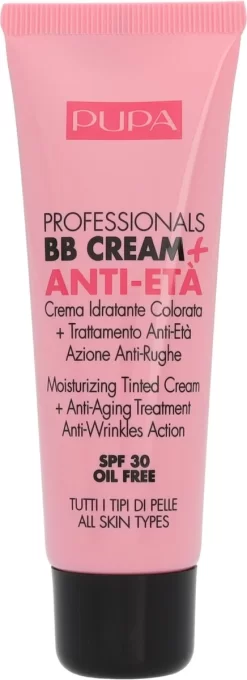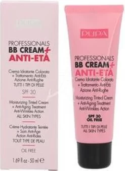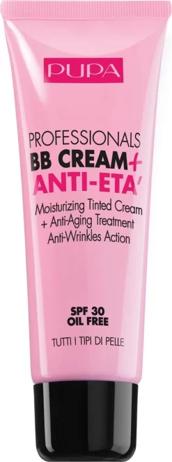 De PUPA BB Cream Anti-Eta is een speciale crème met “anti-aging” behandeling voor het gezicht. De vocht inbrengende crème maakt de huid glad en helpt tekenen van veroudering te beschrijden. De aanwezige SPF 30 bescherming in de crème zorgt ervoor dat de huid beschermt is tegen de schadelijk Uv-straling van de zon. Deze multifunctionele BB Cream is een perfecte crème voor mensen met weinig tijd, maar die wél een verzorgde en stralende huid willen!