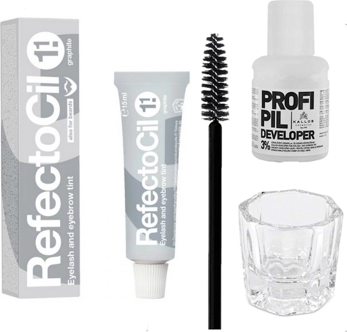 Creëer prachtige wenkbrauwen en laat je wimpers nog meer spreken met de Refectocil Henna Set Incl. Brush & Mengglas #1.1 Grafiet Grijs.