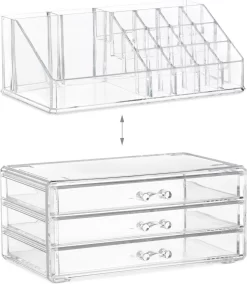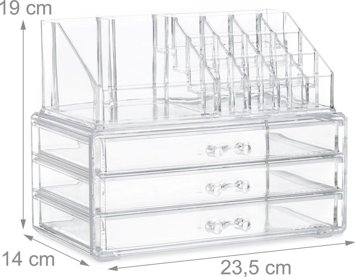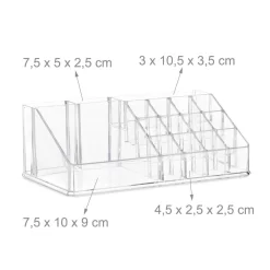 De kleine make-up organizer creëert ruimte op de kaptafel en bespaart je het zoeken in je toilettas. De tweedelige make-up standaard biedt met in totaal 19 vakjes veel opslagruimte voor cosmetica en sieraden. De lades zijn geschikt voor crèmes, poeder en oogschaduw, alsook voor horloges, kettingen en armbanden. De praktische houder voor lippenstift is ook geschikt voor nagellak, borstels, stiften en nog veel meer. De houder doet het ook zeker goed als bureau-organizer voor kantoorartikelen of als opbergruimte voor schroeven en ander klein gereedschap.