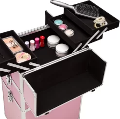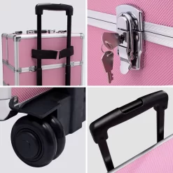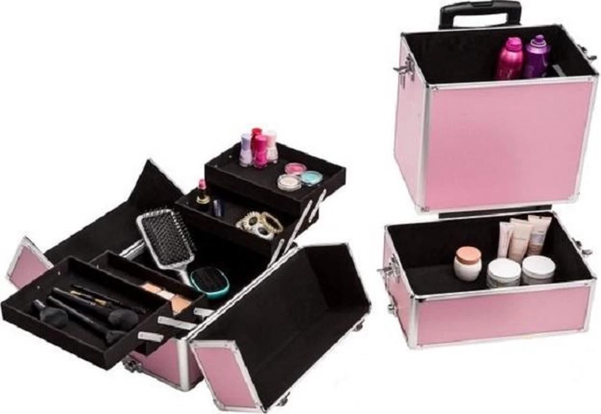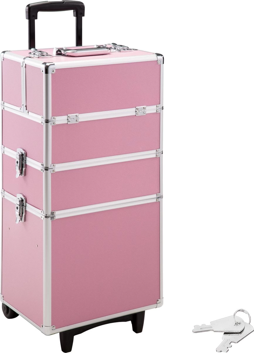 Nooit meer zonder onderweg: Voor make-up, naaigereedschap of andere reisbenodigdheden – de praktische en mooi gevormde cosmeticatrolley van TecTake biedt voldoende ruimte en optimale bescherming voor al uw producten. De koffer bestaat uit 3 met fluweel beklede niveaus die naar believen met elkaar gecombineerd kunnen worden. Het bovenste gedeelte kan individueel als handbagage gebruikt worden. Alle niveaus zijn apart afsluitbaar. De intrekbare handgreep van de combikoffer kan perfect op de verschillende hoogten ingesteld worden. De lichtlopende skaterwielen en de met metaal verstevigde hoeken geven de beautycase maximale mobiliteit en veiligheid. Praktisch, licht en chique: de cosmeticatrolley van TecTake is een trouwe metgezel bij alle toepassingen.