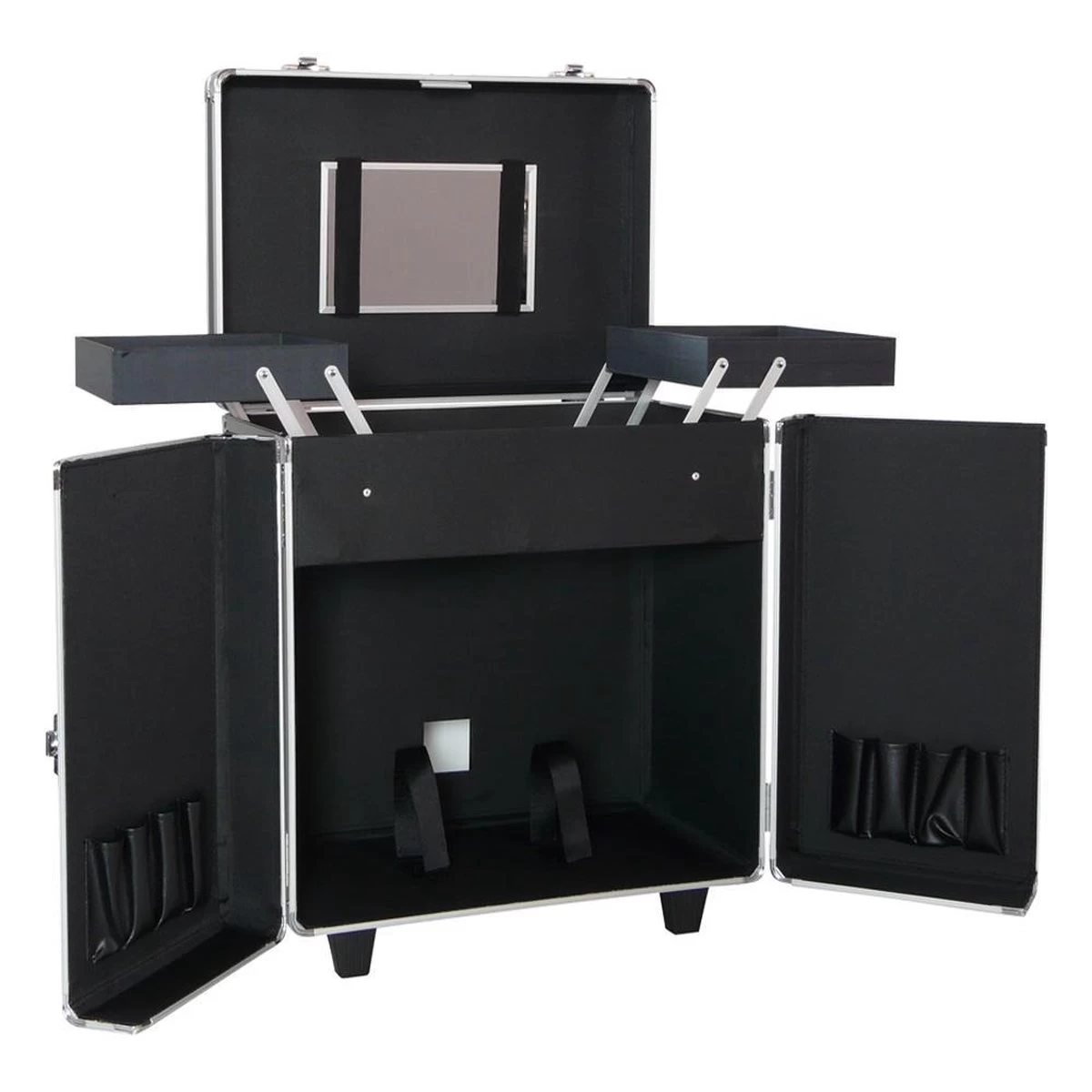 De tweede branche specifiek kenmerk van deze pedicure koffer is de aanwezigheid van de uitneembare verdeling voor de flesjes in het bovenste gedeelte van deze pedicure koffer, zoals flesjes van de nagellak / topcoat / nagellijm / Primer enz. Ook deze cosmetische producten worden perfect beschermd tijdens het vervoer. Verder zijn er nog andere opbergmogelijkheden aanwezig, zoals de grote bovenvak en de mogelijkheid om het klein materiaal in de openstaande deuren van deze pedicure koffer op te bergen. Niet te vergeten is de multifunctionele uitneembare spiegel, dat bovendien ook staand kan worden ingezet.