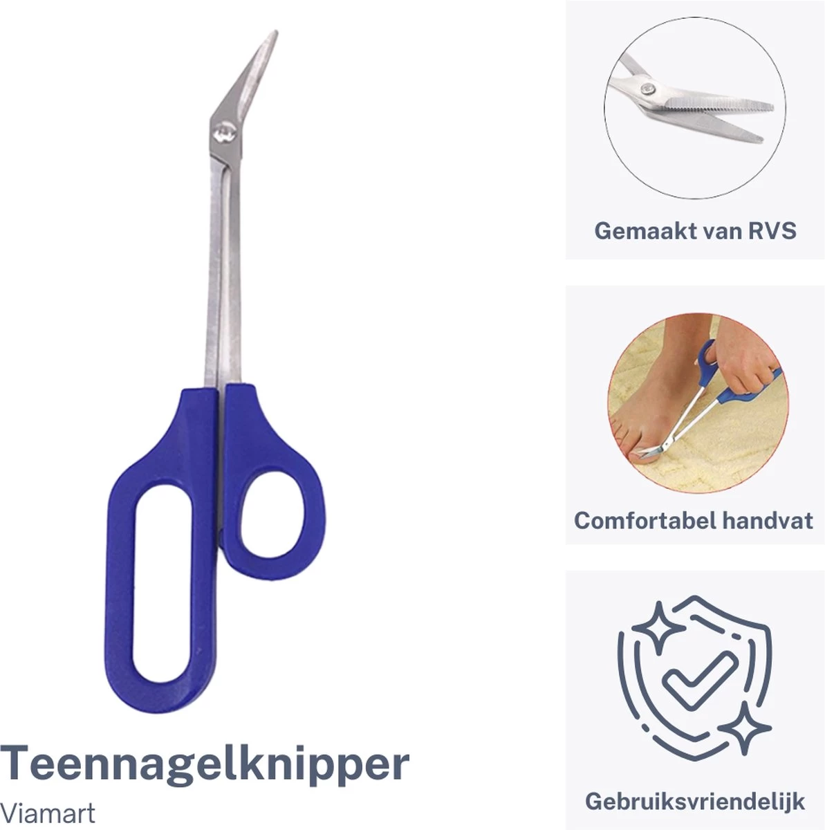 Met deze Viamart extra lange nagelschaar knip je eenvoudig en comfortabel jouw teennagels bij. De nagelschaar is gemaakt van verchroomd staal en plastic materiaal en is 21 centimeter lang, wat betekent dat je nooit meer hoeft te bukken om je teennagels te knippen.