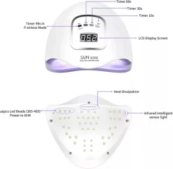 De nageldroger start en stopt automatisch dankzij infarood bewegingssensoren. Hand erin, licht aan. Hand eruit, licht uit. Hierdoor hoef je niet meer op knopjes te drukken met natte nagels. De nageldroger heeft standaard 4 automatische timers (15s, 30s, 60s, 99s). Wil je andere timers instellen of opties combineren, dan kun je jouw persoonlijke instellingen opslaan met de handige memory functie. Op het heldere display kun je precies zien hoeveel seconden op de timer over zijn die toont de timer en laat zien hoeveel seconden zijn.