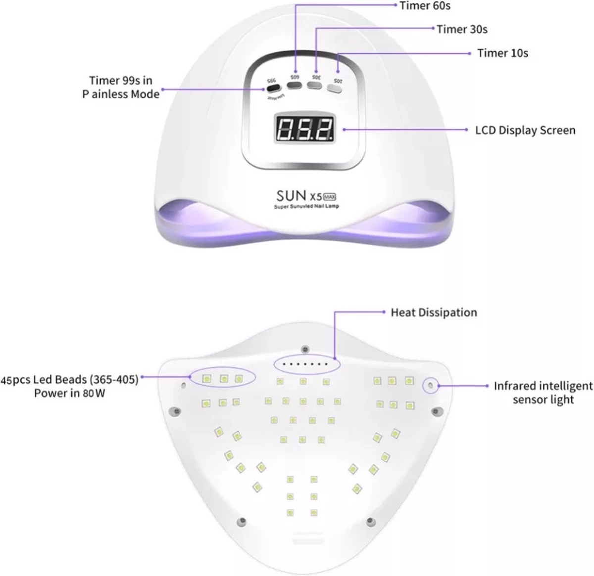 UV nagel producten als UV-gel of UV-coating hebben normaal lange tijd nodig om te drogen. Met deze extreme UV LED lamp nageldroger met wel 45 Leds lampen kunt u snel en efficiënt droge nagels krijgen en de wachttijd sterk verminderen. Bovendien heeft deze lamp 150W vermogen waardoor uw nagels sneller drogen dan de andere modellen. De UV LED lamp gaat sensor aan als u uw hand eronder legt. Ook gaat hij sensor uit als u uw hand uit de lamp haalt.